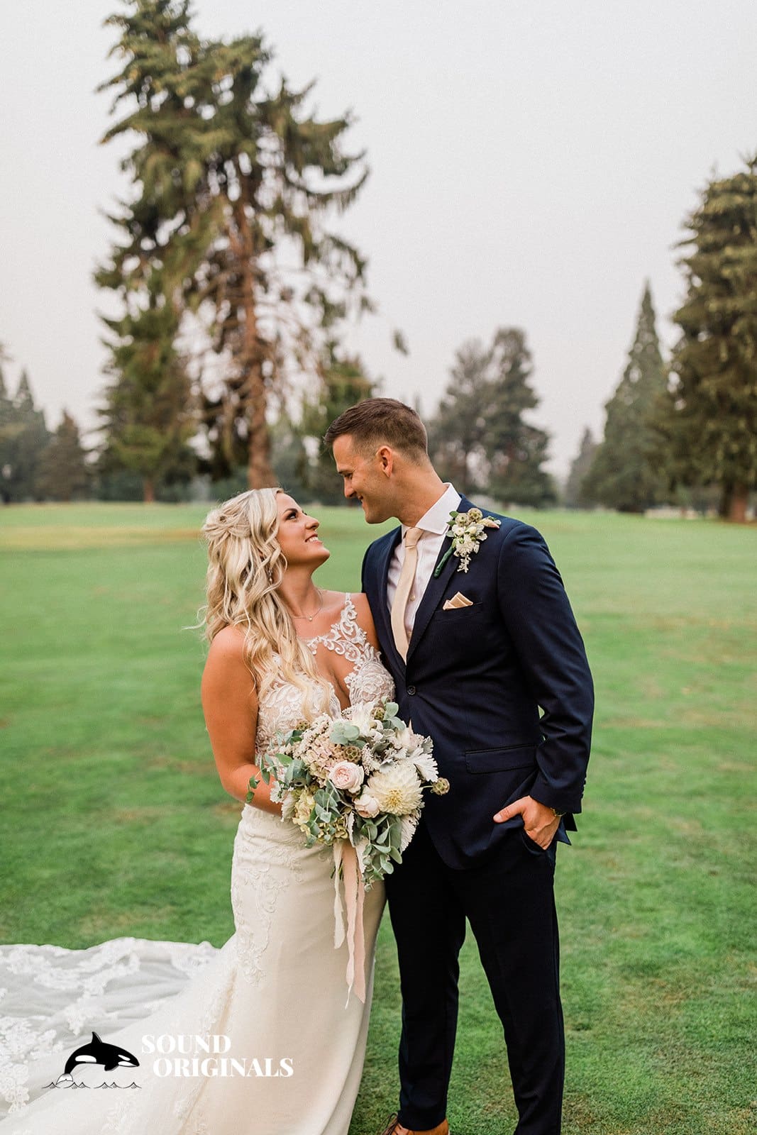 Madison and Daniel’s wedding took place at the Emerald Valley Golf Club in Creswell, OR, about two hours south of Portland. The venue also offers overnight accommodations at the Creswell Comfort Inn & Suites. Madison got ready in the bridal changing area, wearing a gown with a white lace overlay on a nude bodice. Her blonde hair was curled and adorned with baby’s breath flowers. She carried a bouquet in shades of white, soft green, and light pink. Daniel wore a navy suit with a matching boutonniere, along with a gold tie and pocket square.