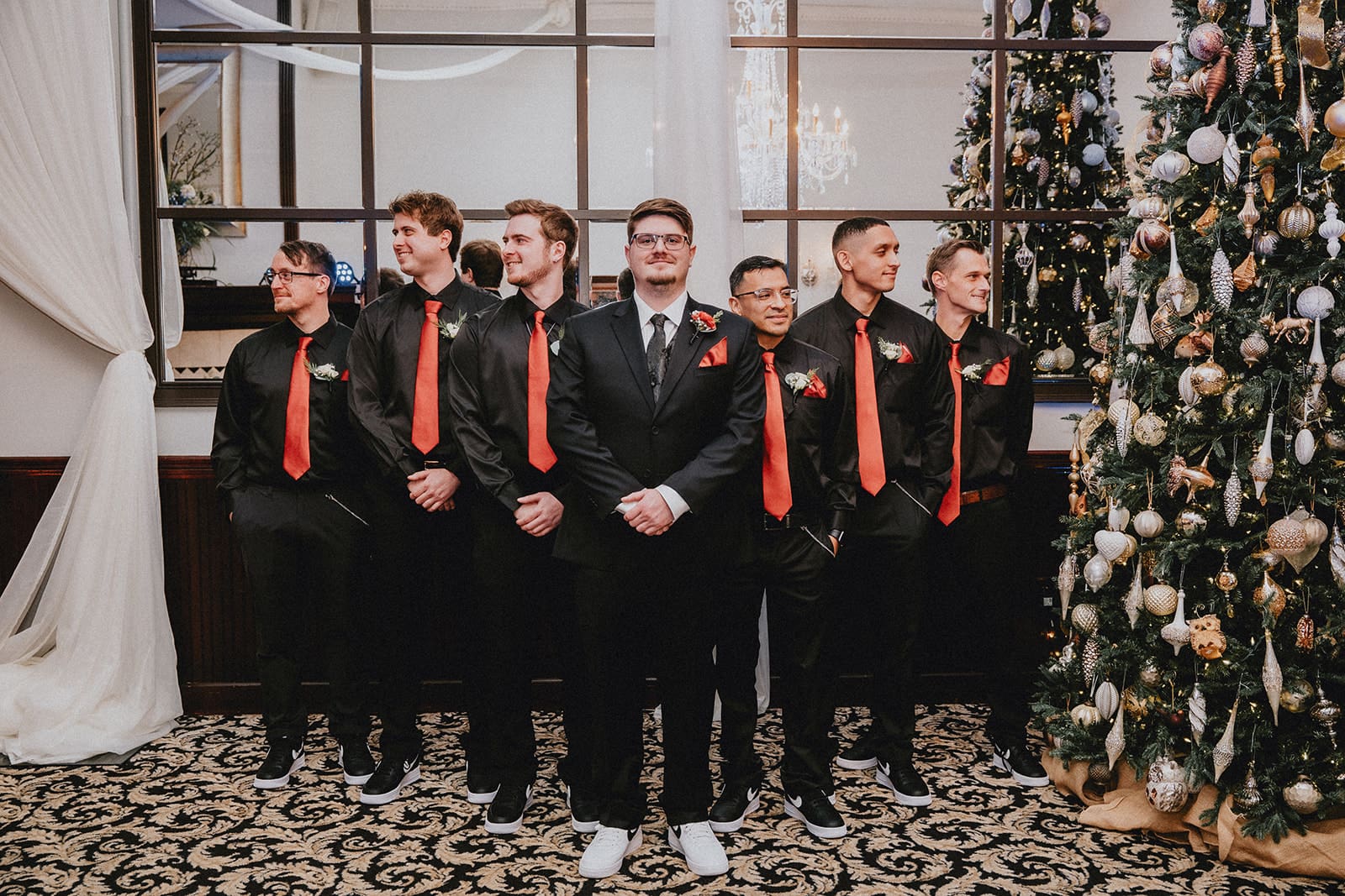 The day began with intimate moments as Savanna prepared for the ceremony alongside her bridesmaids dressed in vibrant red gowns. Joshua shared heartfelt laughs with his groomsmen before taking his place to await his bride. The couple’s vows, exchanged under twinkling lights and festive décor by Forte, left no dry eye in the room. The estate’s cozy ambiance made every moment warm and welcoming, reflecting the couple’s deep connection.