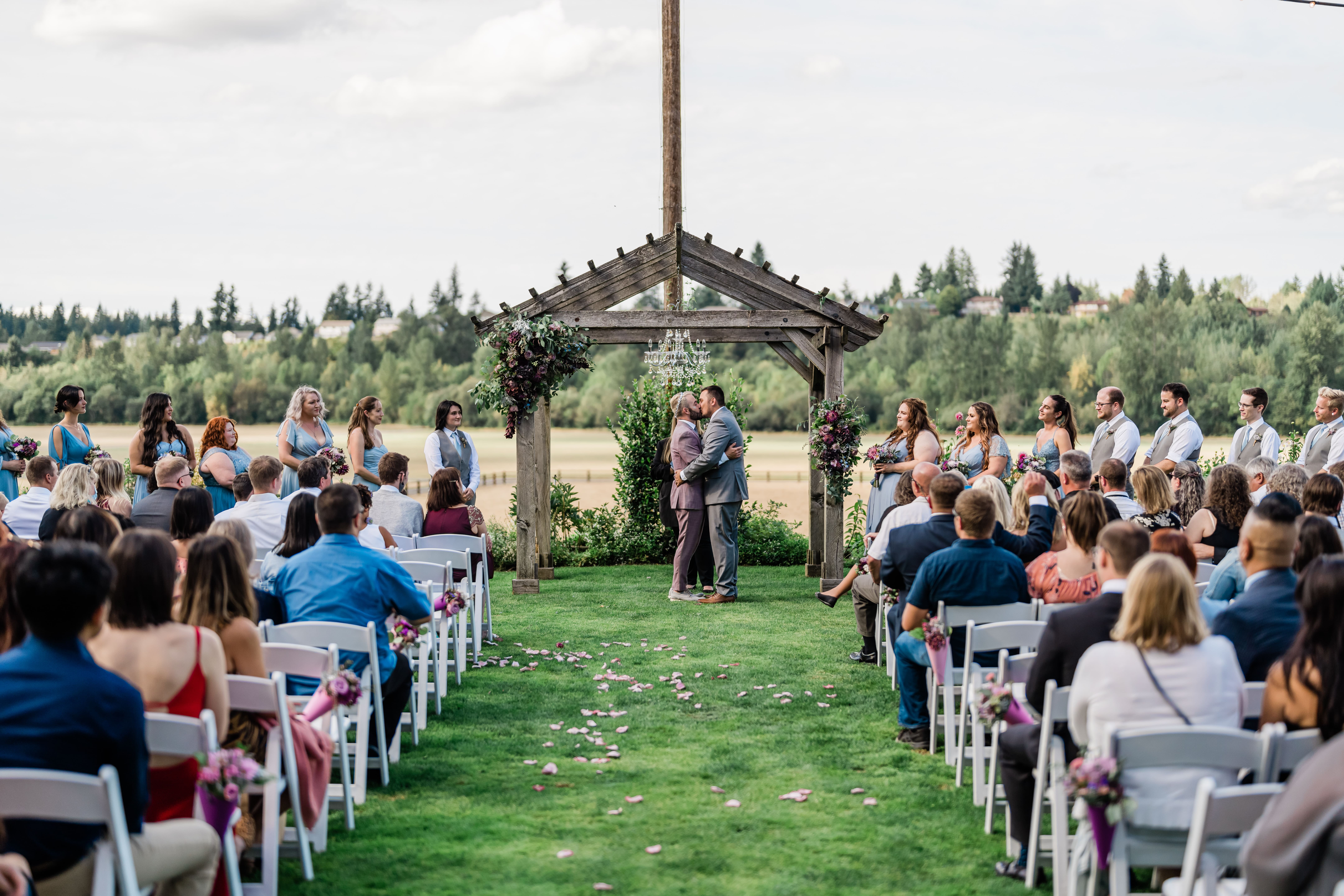 The Kelley Farm in beautiful Bonney Lake, WA is an amazing venue location for a rustic-glam farm wedding! We loved spending the day with Tyler and Jay as they married each other on a lovely PNW afternoon. They began their day getting ready in separate rooms in the venue’s beautiful cottage. We loved taking photos of the details in such a historic setting. Tyler and Jay then prepared to see each other for the first time and the moment was beautifully captured by us. Handwritten messages were read and we took some photos in the flower-filled garden.