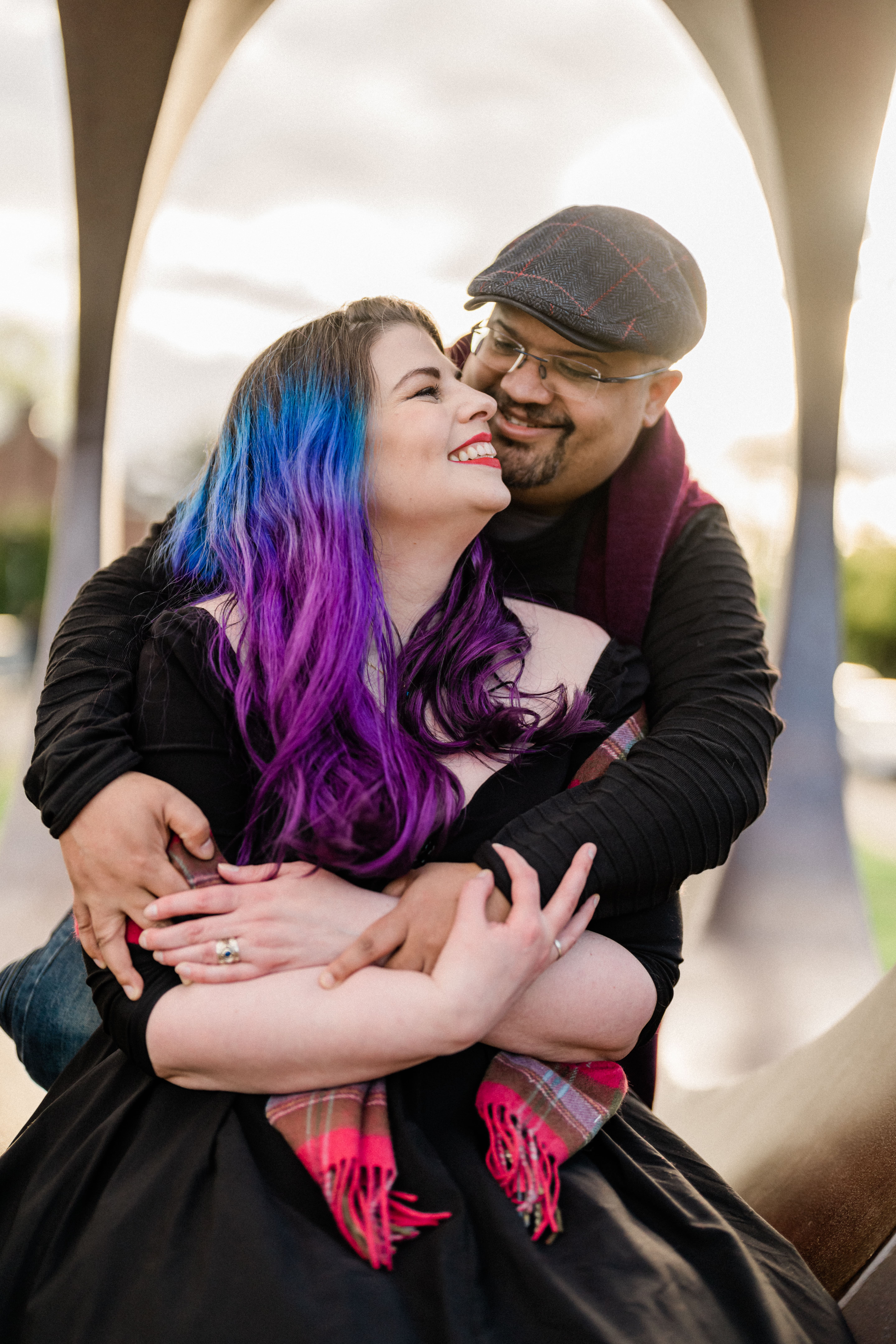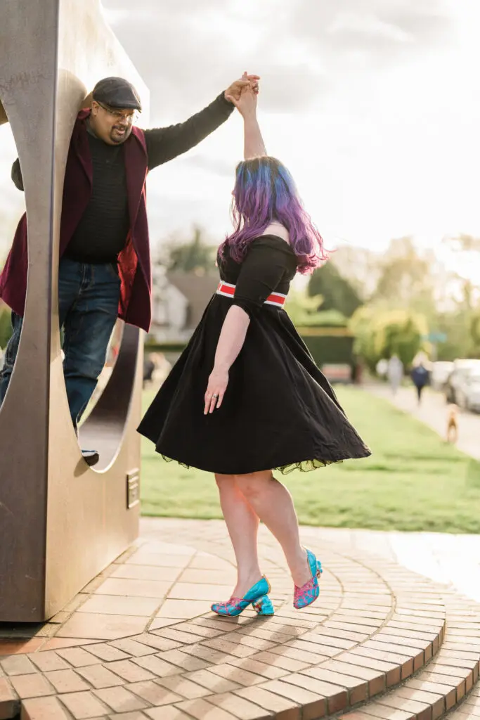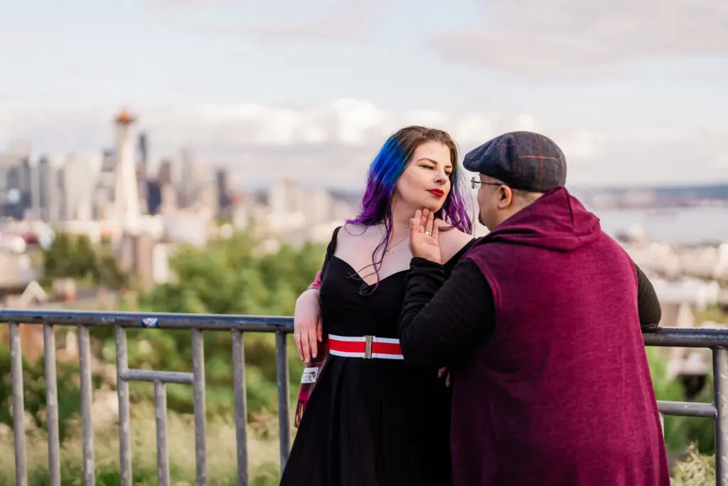 We began our engagement session at a circular arch in front of the park. This gave our photos a playful mood. The couple twirled, danced, and laughed. Surprisingly, the arch added a touch of elegance to the photos. Next, we visited Kerry Park‘s grassy area. The versatility of this park makes it a prizewinning location. The greenery gave us a cute foreground for some mystery in the photos. At the top of the viewpoint, we focused on movie-like shots to capture the surreal location. We couldn’t forget to show off their custom-made engagement rings! These shots are a must for any engagement session.