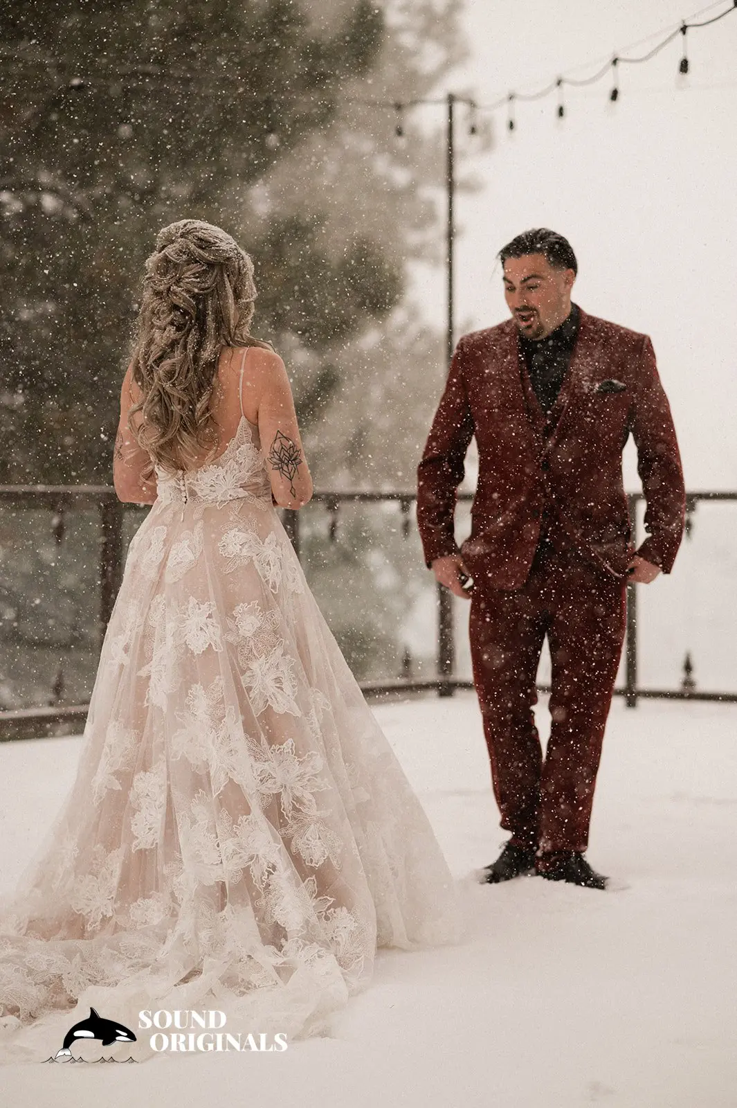 On a freezing morning, our California Wedding Photographers captured the magic of a winter wedding. Heather and Dane prepared in separate suites, styled by the Fuse Hair & Beauty team. Heather looked angelic in her ivory gown, while Dane looked dashing in a maroon and black suit. The snowy backdrop set the scene for romantic wedding portraits, beautifully captured by our photographers.