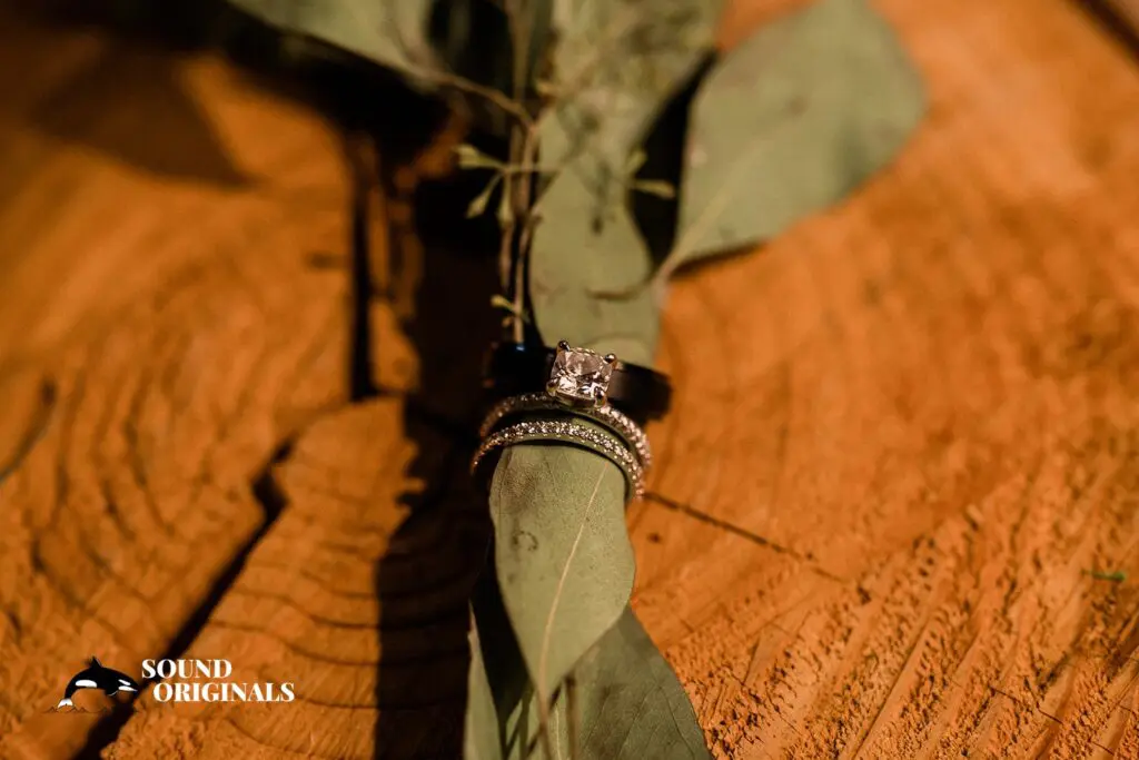 Your photographers should get creative with pictures of the wedding rings. In this photo from Mallory and Kevin’s SODO Park wedding, our Seattle wedding photographers put the engagement ring and wedding bands on a leaf. As a result, the picture shows an element of the natural surroundings in the Pacific Northwest. You might want to get your rings polished so they’ll sparkle in pictures!