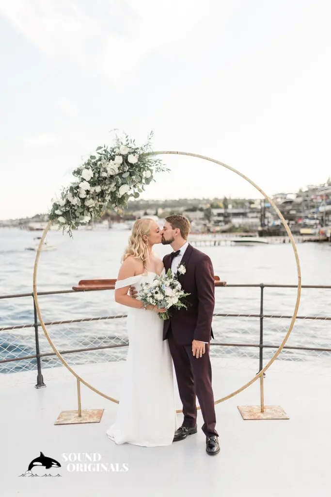 From intimate indoor ceremonies with white wood-paneled walls and charming porthole windows to outdoor vows beneath a golden circle arbor, MV Skansonia provides the perfect canvas for photographers to work their magic. The shimmering waters and picturesque views make for breathtaking shots that will be cherished for life.
