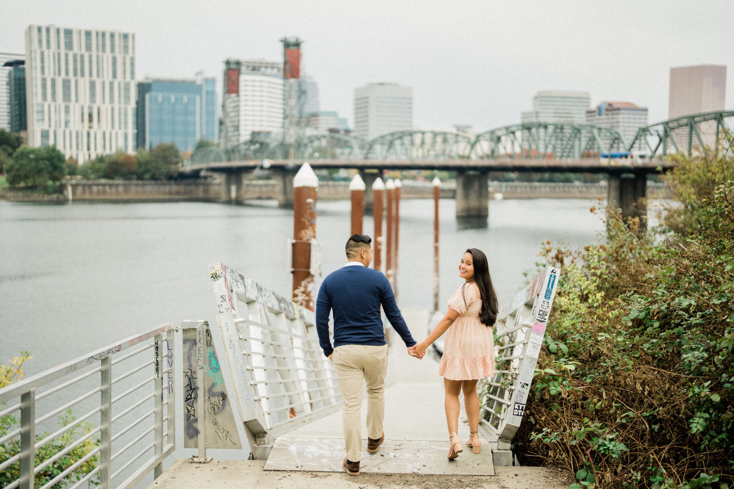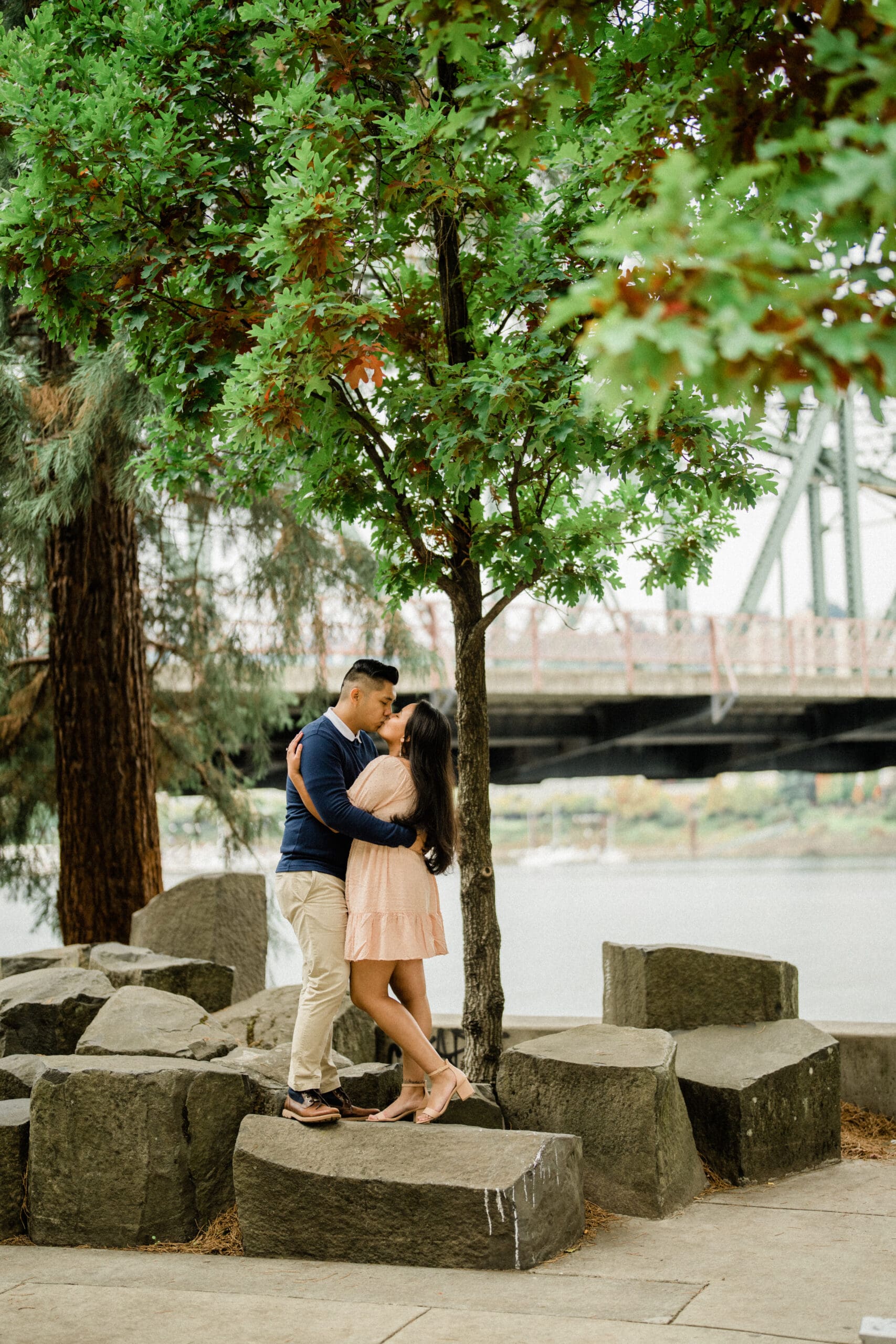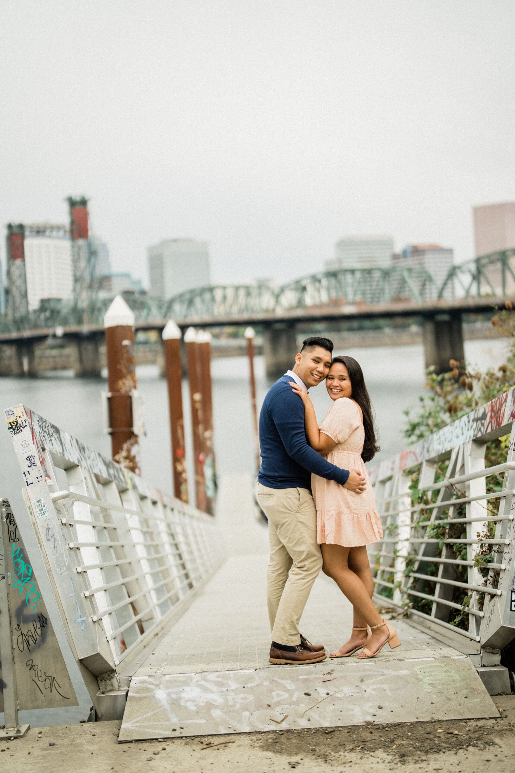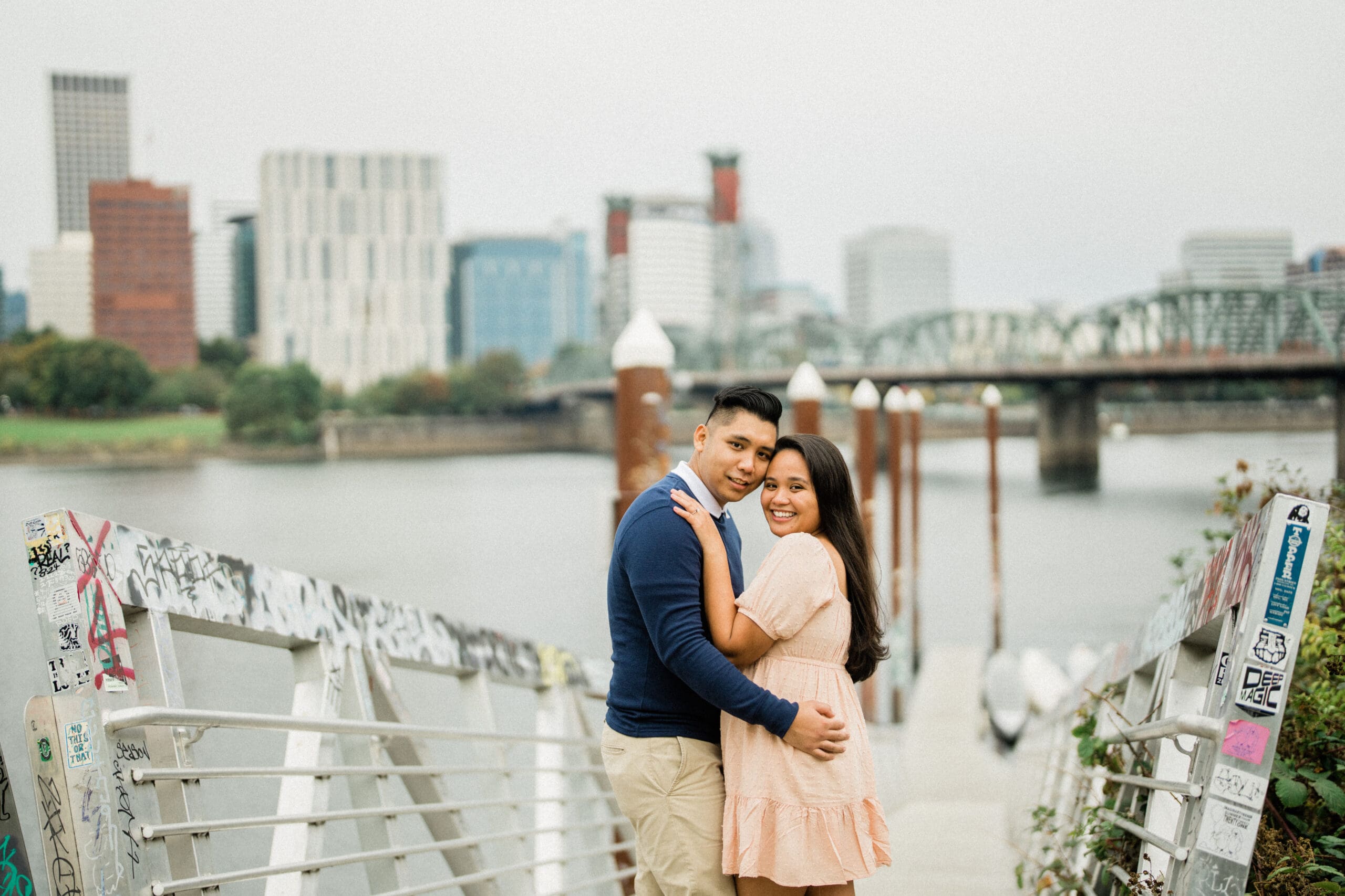 Jerri and Louie began their session with a walk by the water, hand in hand, smiling under the soft Portland light. Their navy and blush outfits looked perfect against the gentle green tones of the park and the muted colors of the city. Our professional engagement photographer focused on capturing their connection in a relaxed and fun way. There were moments of playful laughter, quiet embraces, and sweet glances that showed their genuine love. Every photo felt honest and full of life, just like them.