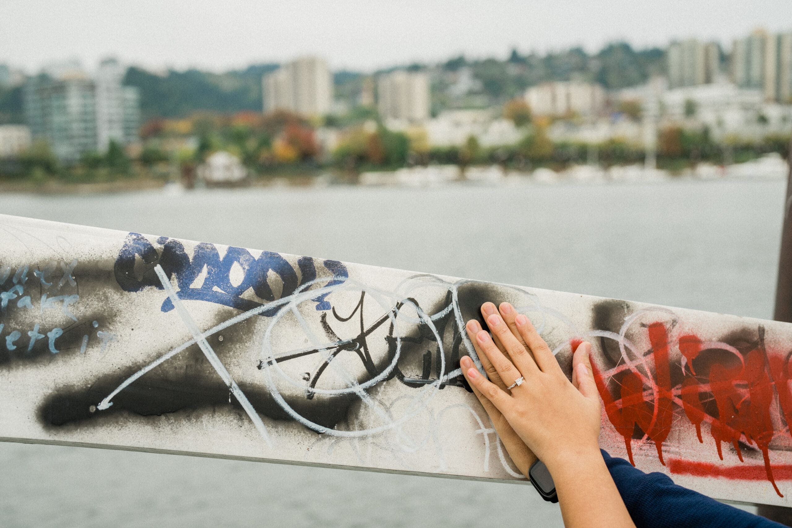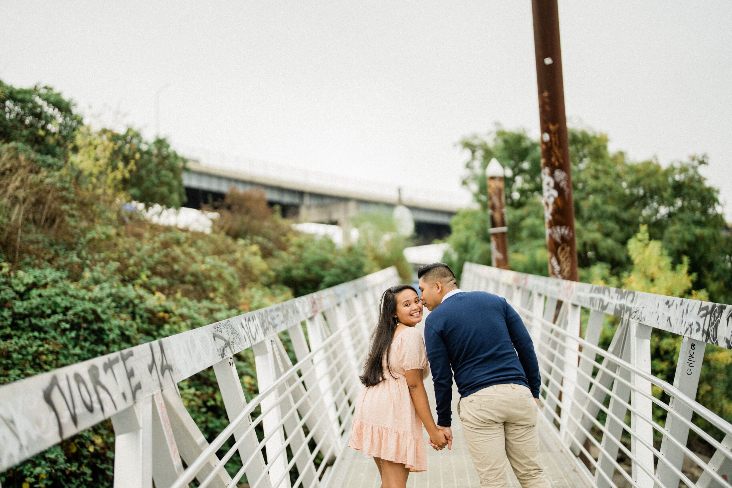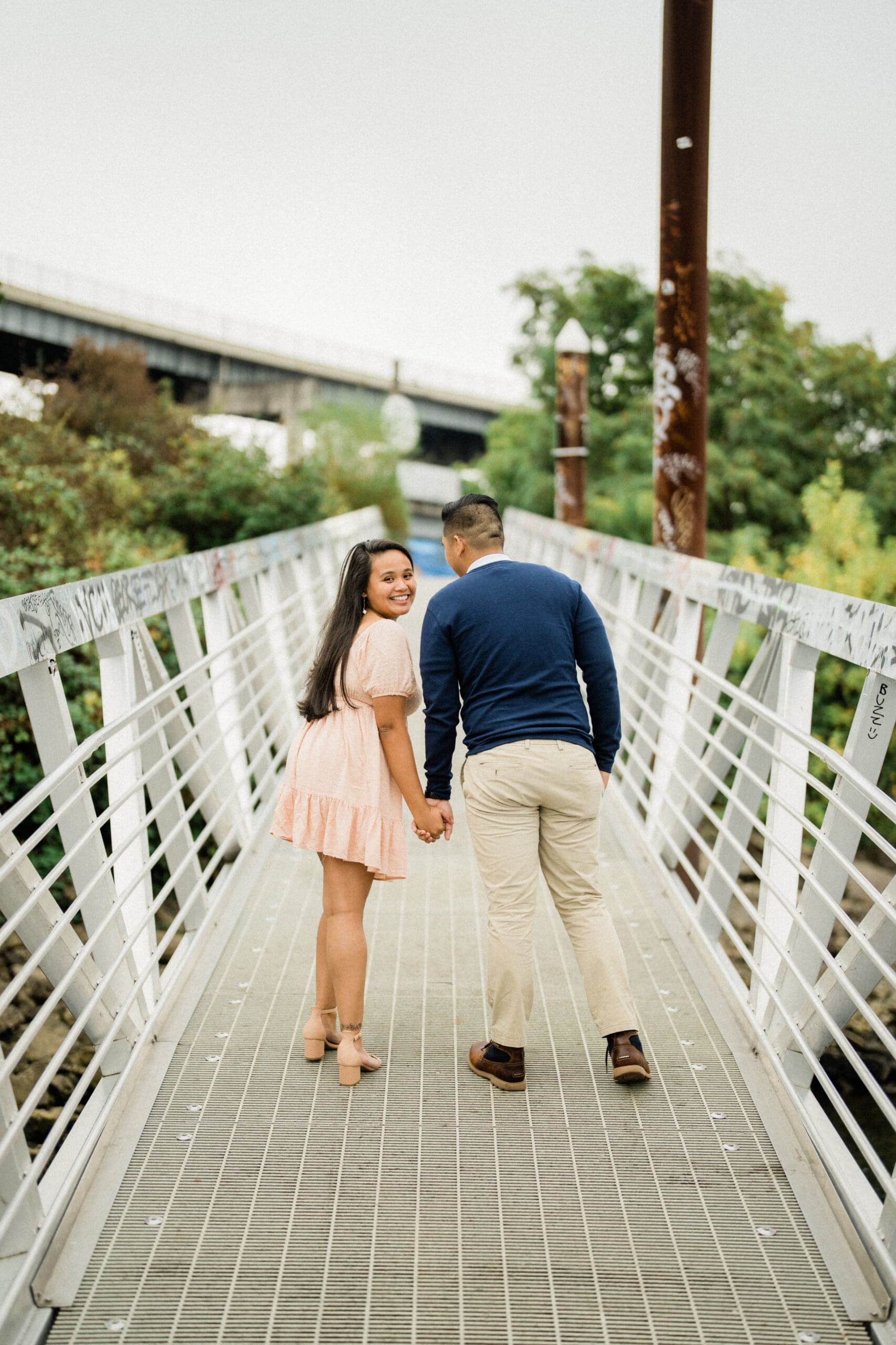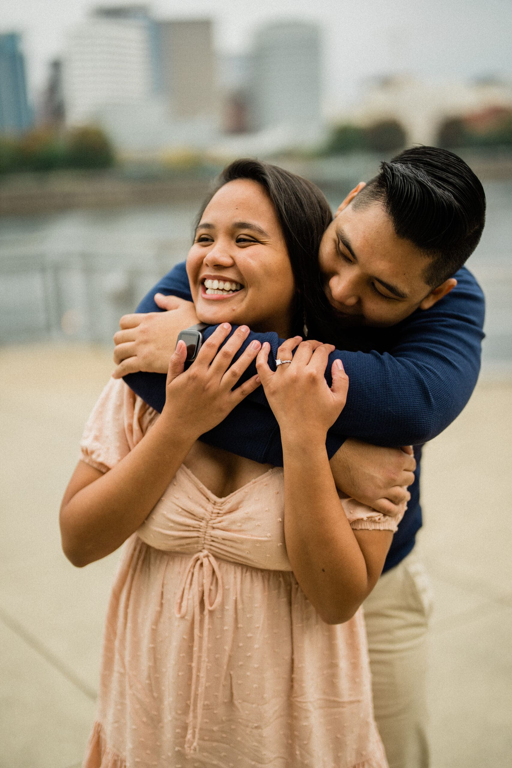 Jerri and Louie began their session with a walk by the water, hand in hand, smiling under the soft Portland light. Their navy and blush outfits looked perfect against the gentle green tones of the park and the muted colors of the city. Our professional engagement photographer focused on capturing their connection in a relaxed and fun way. There were moments of playful laughter, quiet embraces, and sweet glances that showed their genuine love. Every photo felt honest and full of life, just like them.