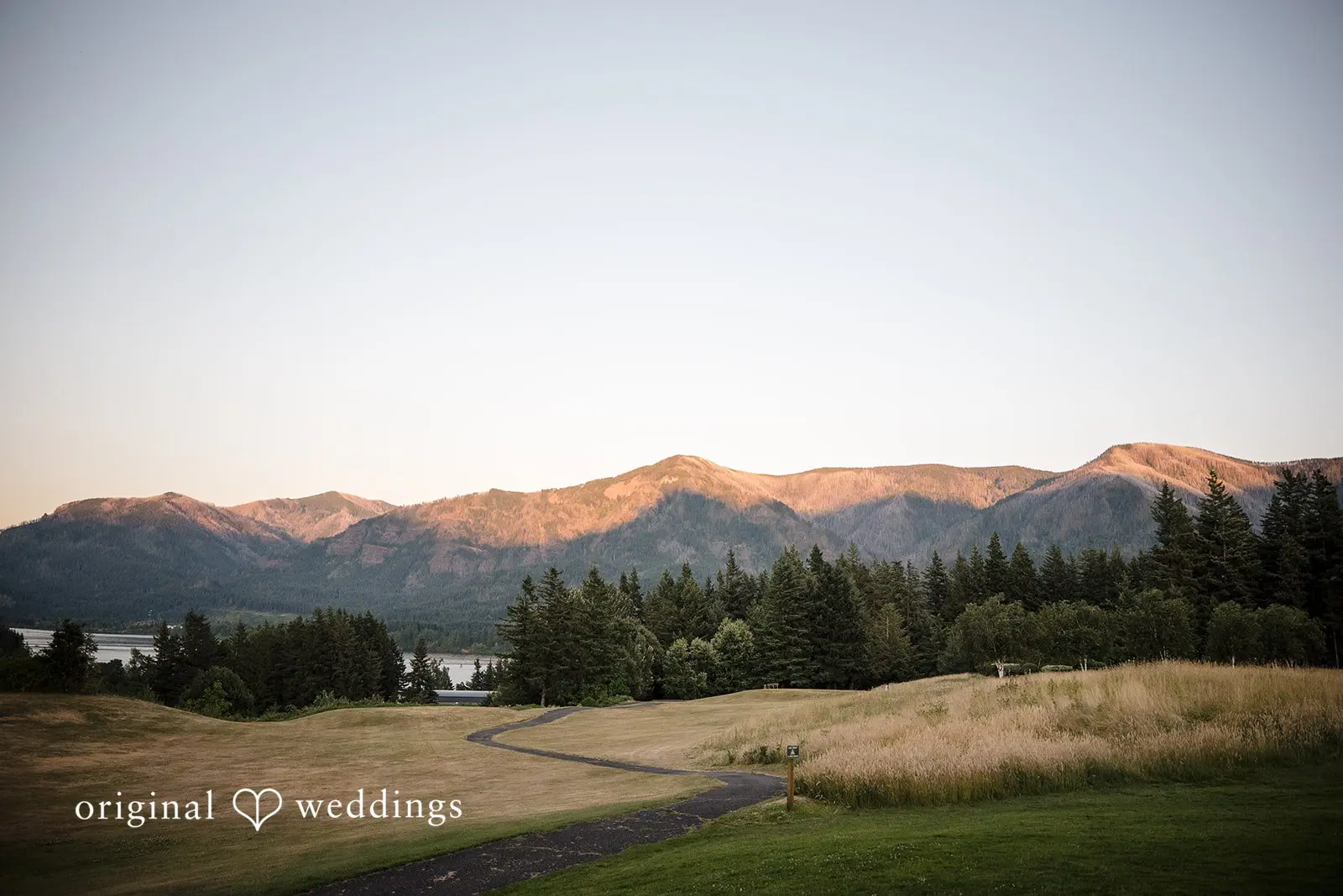 - The Lawn Overlooking the Gorge: A sweeping ceremony backdrop with mountain ridges and the Columbia River glowing in autumn tones.