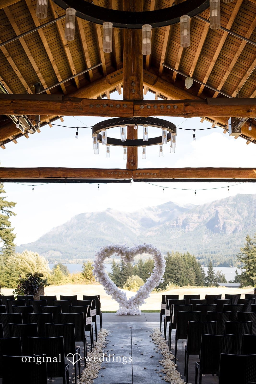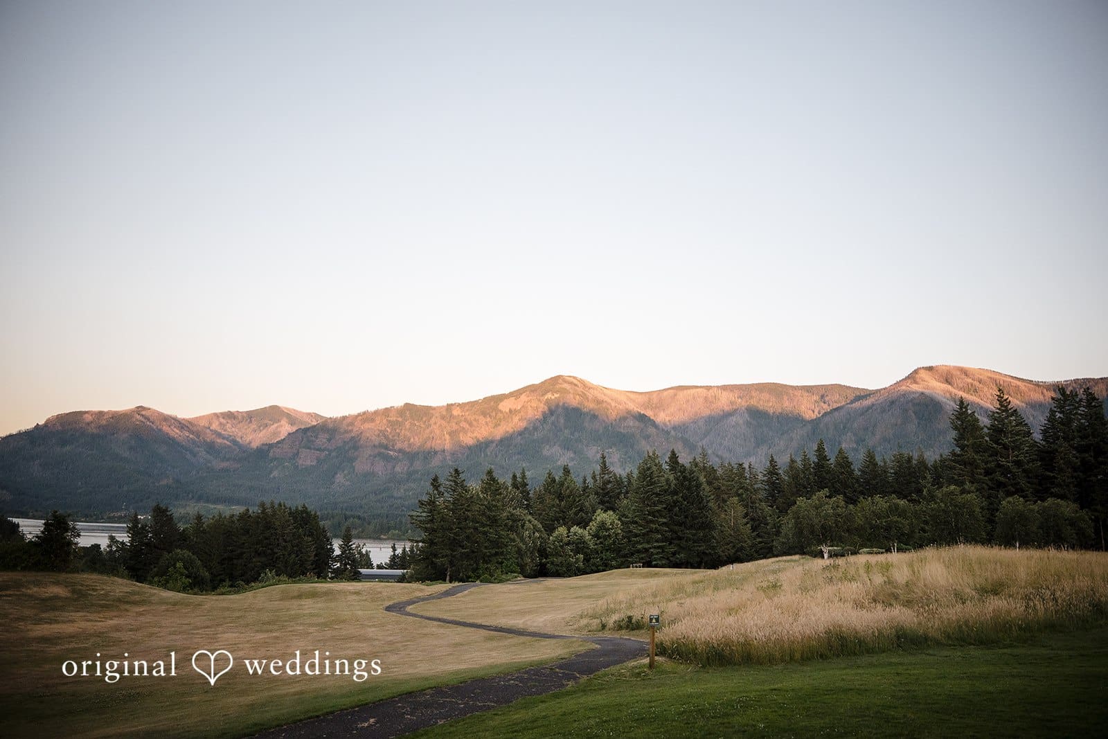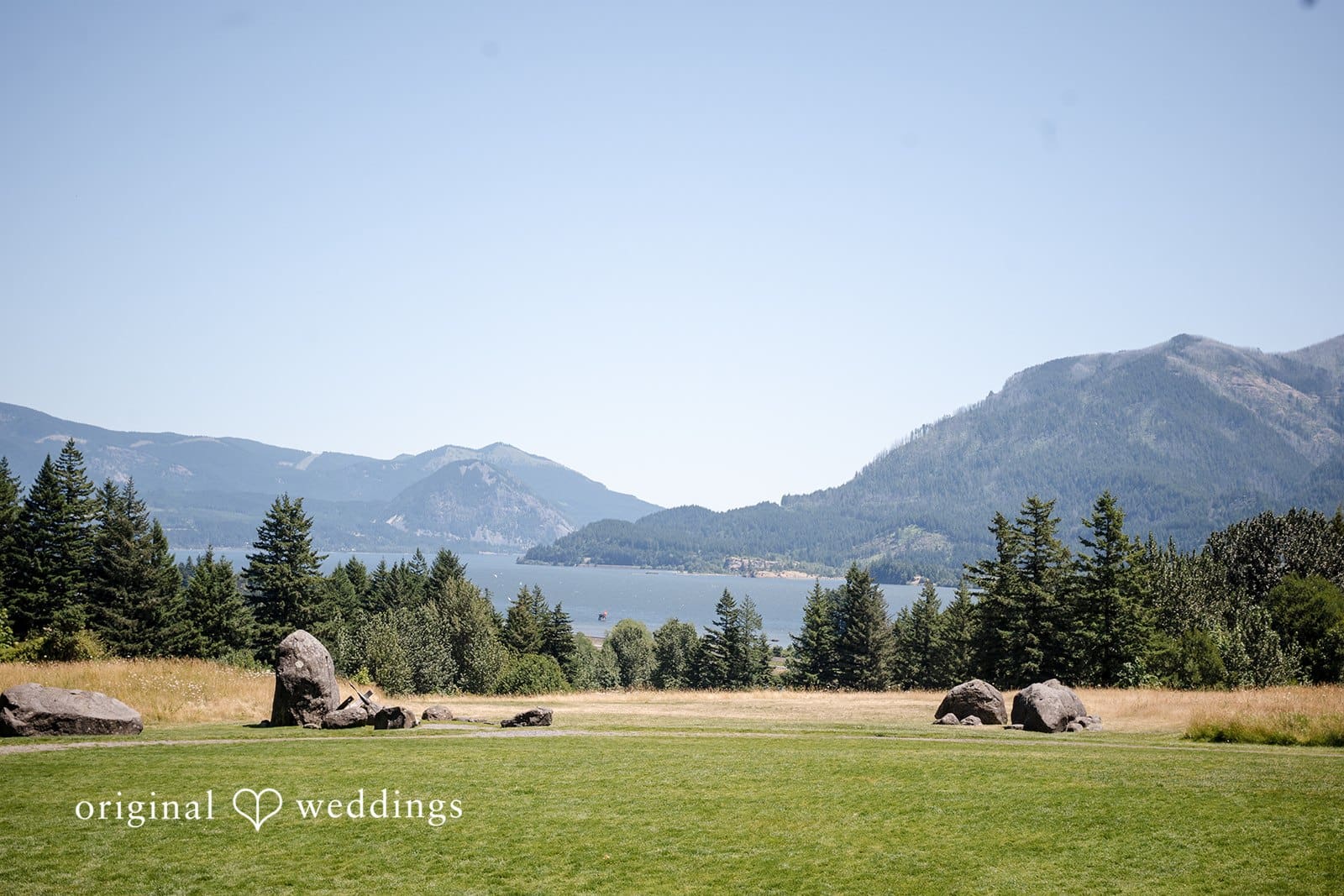 • The Lawn Overlooking the Gorge: A sweeping ceremony backdrop with mountain ridges and the Columbia River glowing in autumn tones.