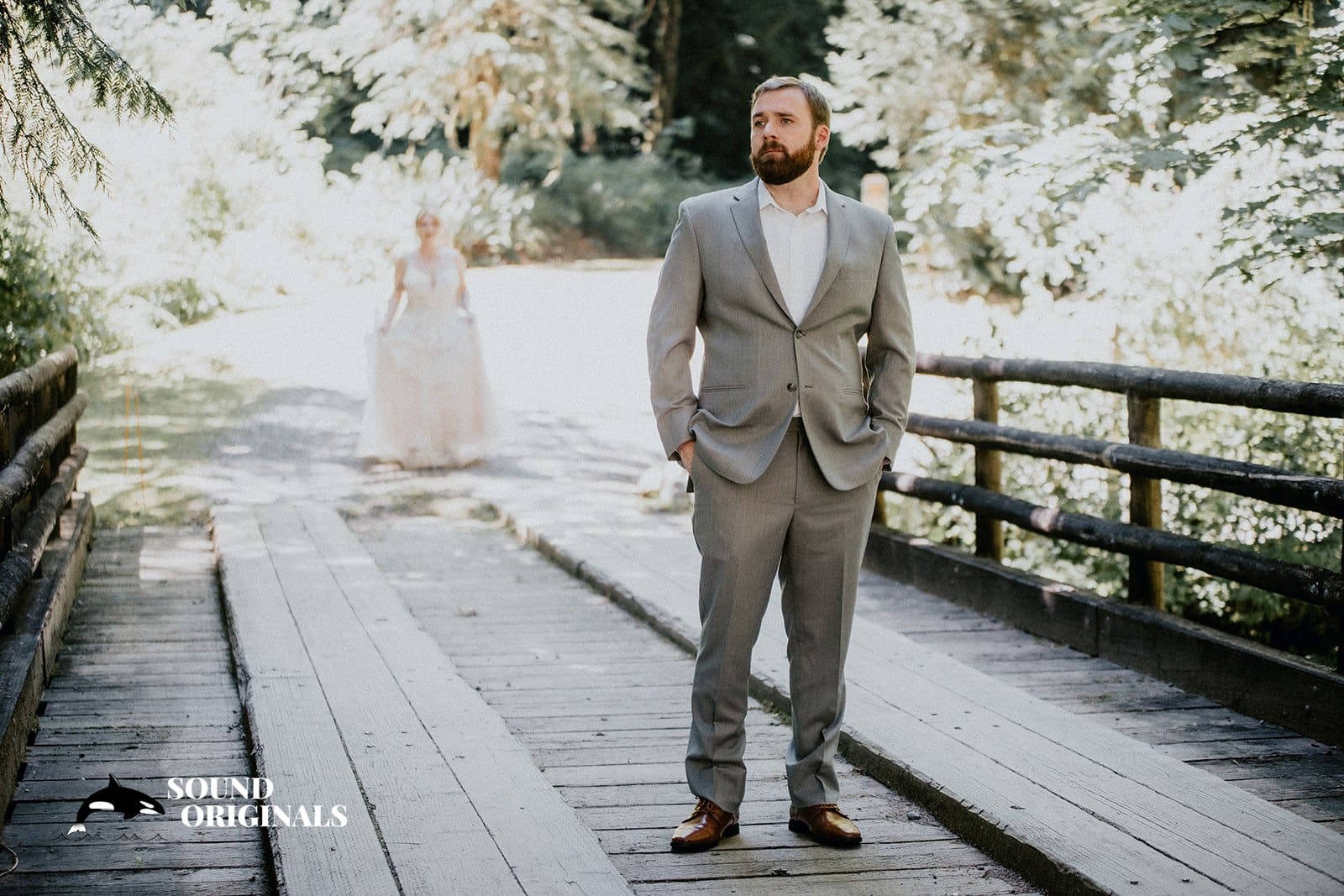 Our professional wedding photographers started their day by capturing gorgeous wedding details and decorations. Once the bride and groom got ready for their big day, they did the sweetest first look together, followed by father-daughter first look moments. Taylor and Steven are beyond gorgeous. The team of Seattle wedding photographers at Sound Originals captured romantic and stunning portraits of the duo in striking natural backdrops of woods. Their wedding portraits among the magical forest backdrops will leave you in awe. This was our first time photographing at Snoqualmie Falls Forest Theater venue, and we’re so in love with it all.