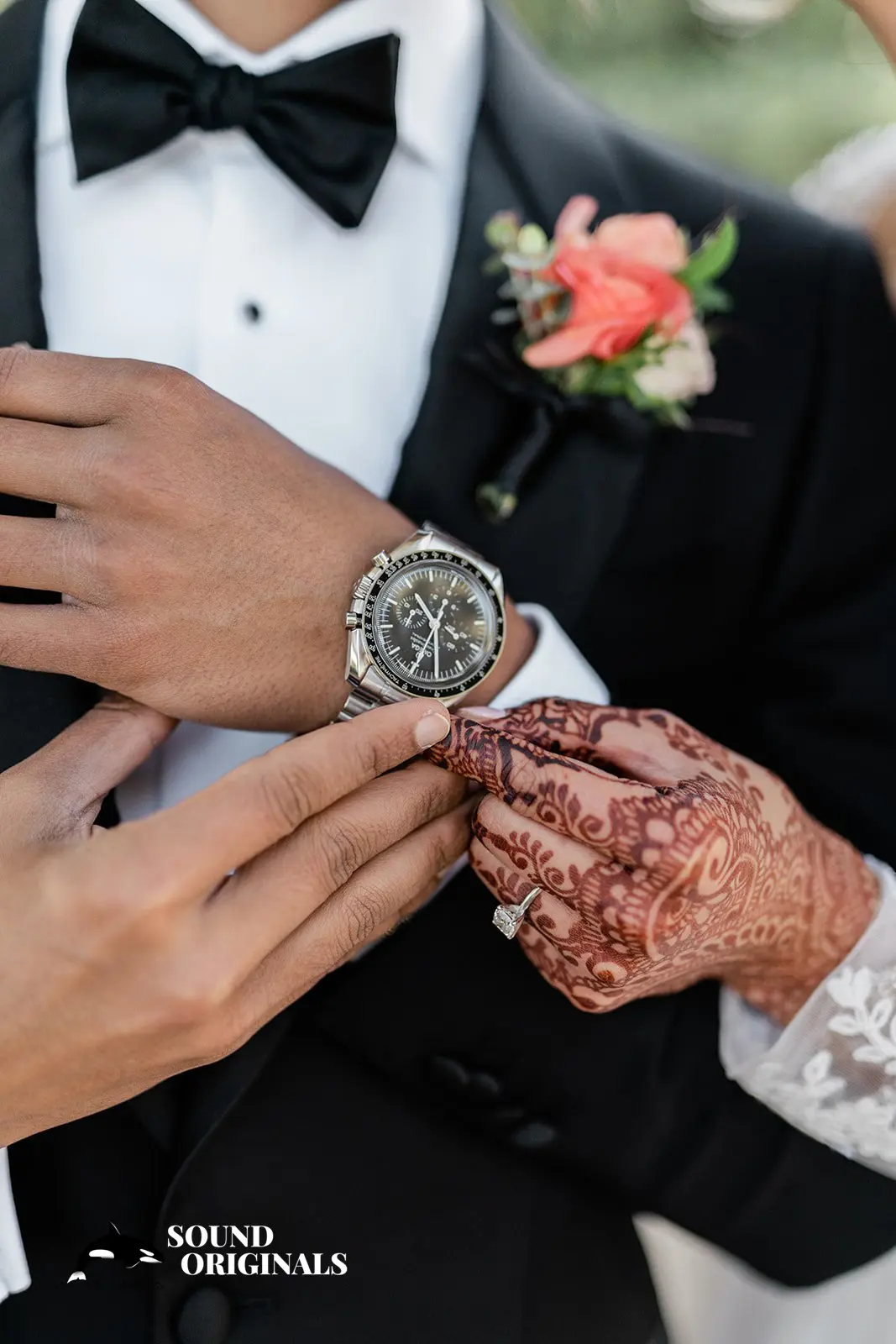 Together, Jessica and Ahilan chose Hannah Anderson-Ryan as their wedding planner. Specifically, Hannah’s company, Sage Weddings & Events, ensured that all of the couple’s wedding day dreams came true. They plan destination and South Asian weddings frequently, and are based on the West Coast. They can plan multi-day and weekend weddings, like what they did for Jessica and Ahilan. Additionally, Lana Starr of Dream Flowers Studio curated the stunning floral arrangements and Jessica’s bridal bouquet. Correspondingly, Ahilan’s boutonniere matched the shades of pink and orange in the bouquet.
