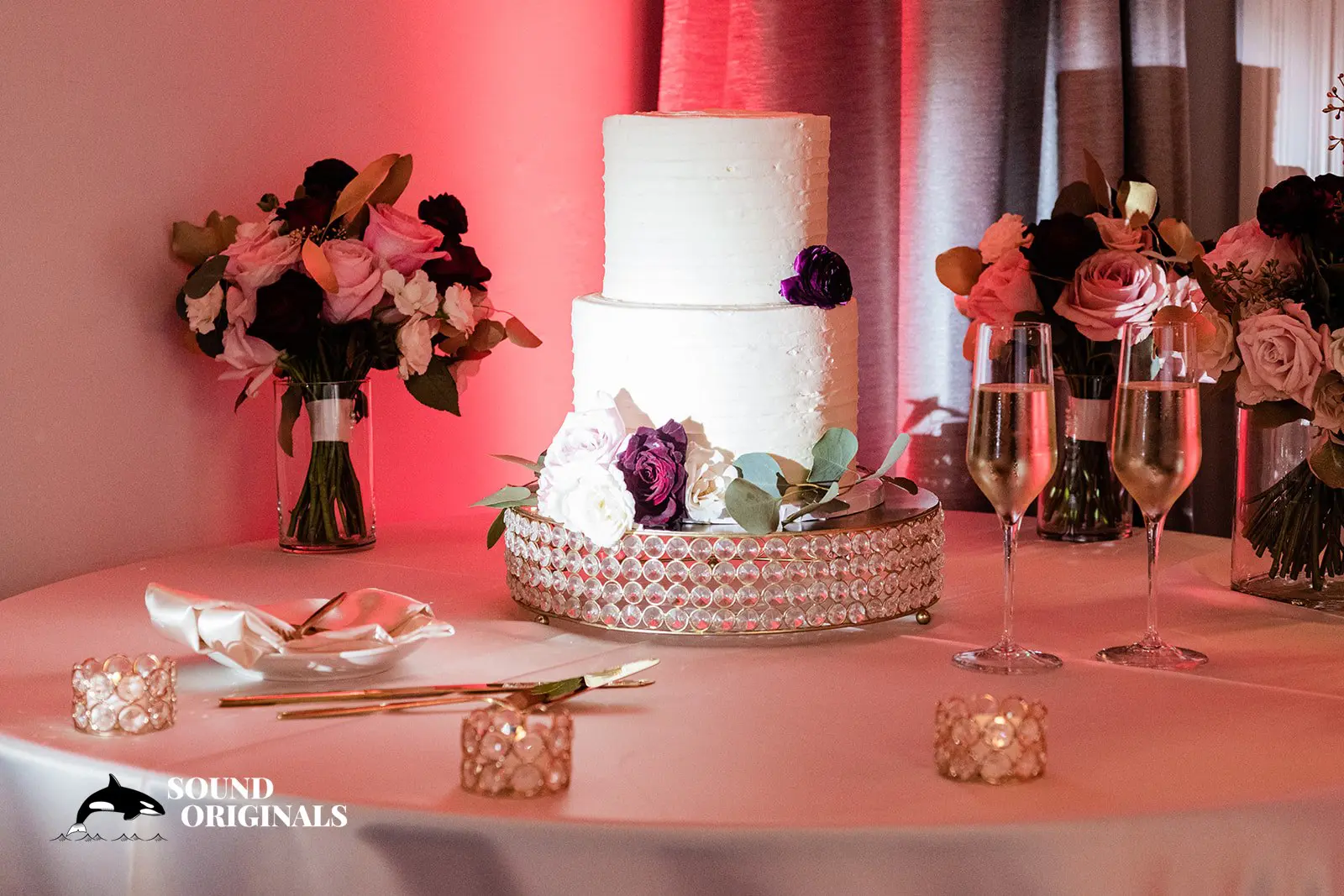 Alexis and Vanessa’s outdoor ceremony unfolded on a manicured lawn with breathtaking hillside views. They exchanged heartfelt vows, rings, and a kiss, surrounded by blessings from guests. Following family photos, the couple entered the elegant reception hall adorned with mirrors, chandeliers, and draped ceilings. Toasts were made, cake was cut, and the festivities kicked off with music. The dance floor quickly filled with guests, enveloping the couple in love and energy. Neon lights illuminated the joyful atmosphere as everyone danced into the night.